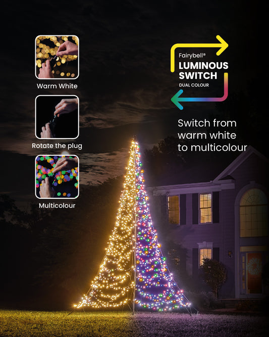 Discover the enchanting world of Luminous Switch with the latest variant from Fairybell! With no less than 1500 energy-efficient LED lights, this 4-meter high flagpole Christmas tree offers an extra dose of light. What makes this variant so special is the possibility to easily switch between warm white and sparkling multicolor lighting or even a combination of both!