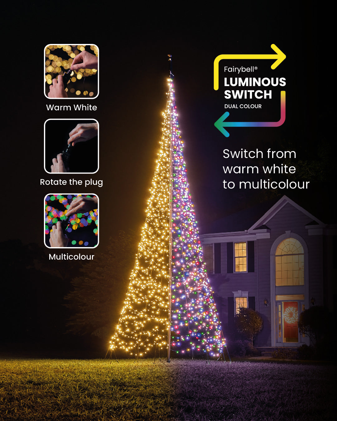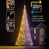 Discover the enchanting world of Luminous Switch with the latest variant from Fairybell! With no less than 2000 energy-efficient LED lights, this 6-meter high flagpole Christmas tree offers an extra dose of light. What makes this variant so special is the possibility to easily switch between warm white and sparkling multicolor lighting or even a combination of both!